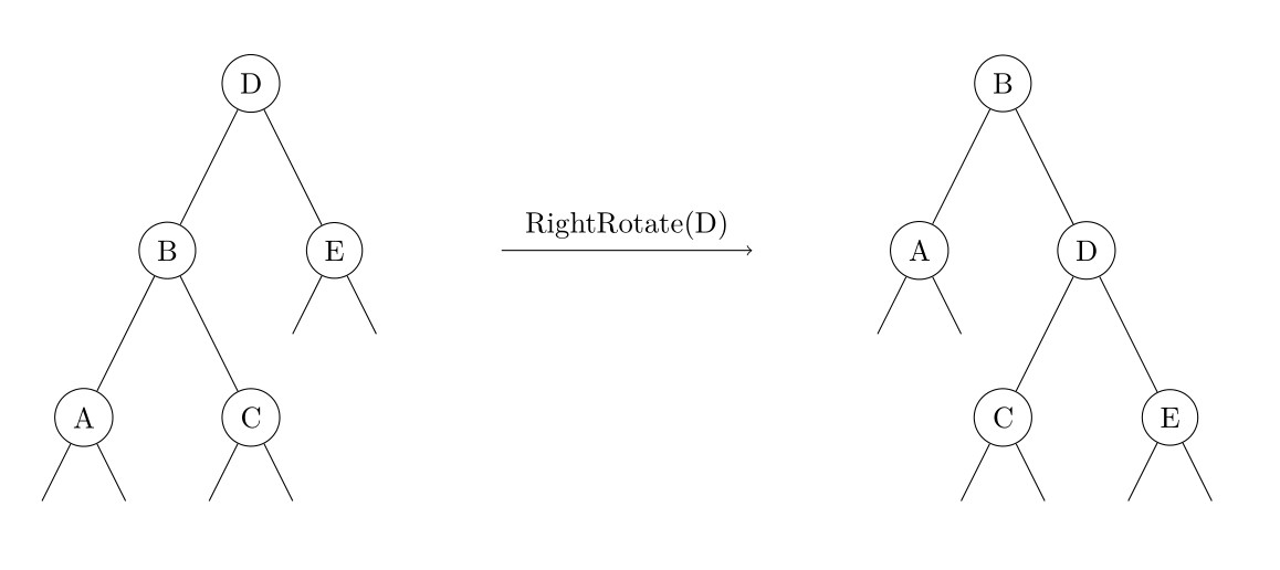 其中 h(C)\geq x 是由于节点 B 满足性质 2,因此 h(C) 和 h(A) 的差不会超过 1。此时我们对节点 D 进行一次右旋操作(旋转操作与其它类型的平衡二叉搜索树相同),如下图所示。