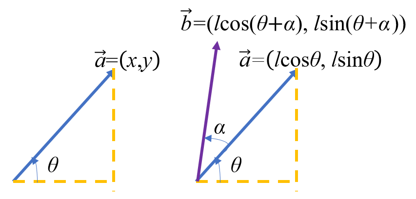 设 \boldsymbol a=(x,y),倾角为 \theta,长度为 l=\sqrt{x^2+y^2}。则 x=l\cos \theta,y=l\sin\theta。令其逆时针旋转 \alpha 度角,得到向量 \boldsymbol b=(l\cos(\theta+\alpha),l\sin(\theta+\alpha))。