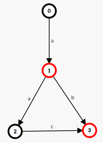 如,一个接受且仅接受字符串 "a", "ab", "aac" 的 DFA: