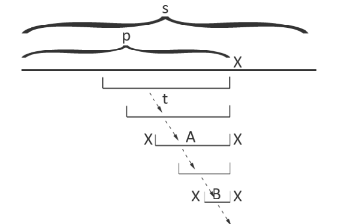 我们通过跳 fail 指针找到 A 所对应的节点,然后两边添加 X 就到了现在的回文串了(即 XAX),很显然,这个节点就是以 p 结尾的最长回文子串对应的树上节点。(同时,这个时候长度 -1 节点优势出来了,如果没有 X 能匹配条件就是同一个位置的 s_p=s_p,就自然得到了代表字符 X 的节点。)此时要判断一下:没有这个节点,就需要新建。