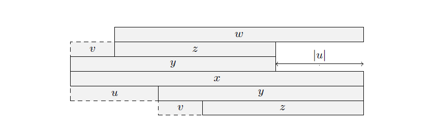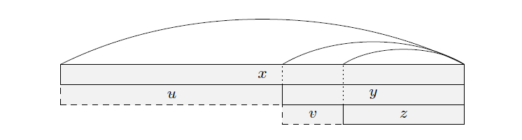因为 y 是 x 的 border,所以 v 是 x 的前缀,设字符串 w,满足 x=vw(如下图所示),其中 z 是 w 的 border。考虑反证法,假设 |u| \le |z|,那么 |zu| \le 2|z|,所以由引理 2,w 是回文串,由引理 1,w 是 x 的 border,又因为 |u| > |v|,所以 |w| > |y|,矛盾。所以 |u| > |z|。