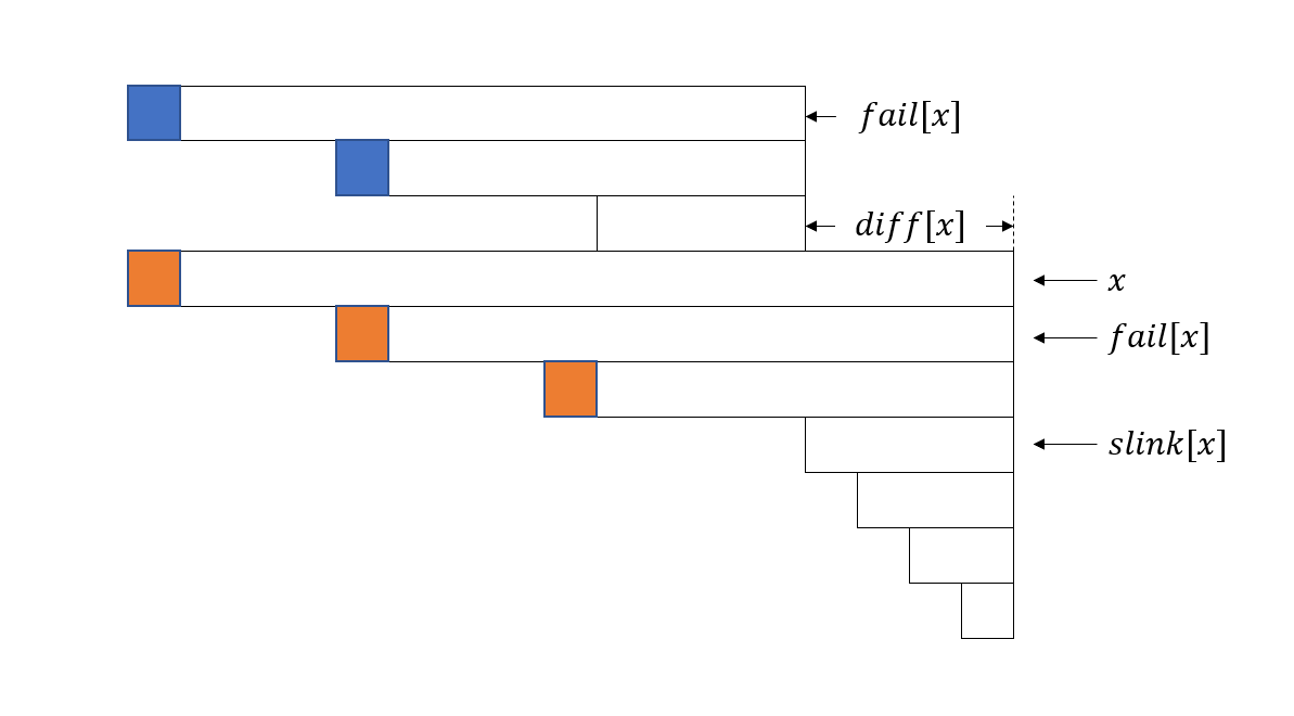 根据引理 1,fail[x] 是 x 的 border,因此其在 i-diff[x] 处出现。