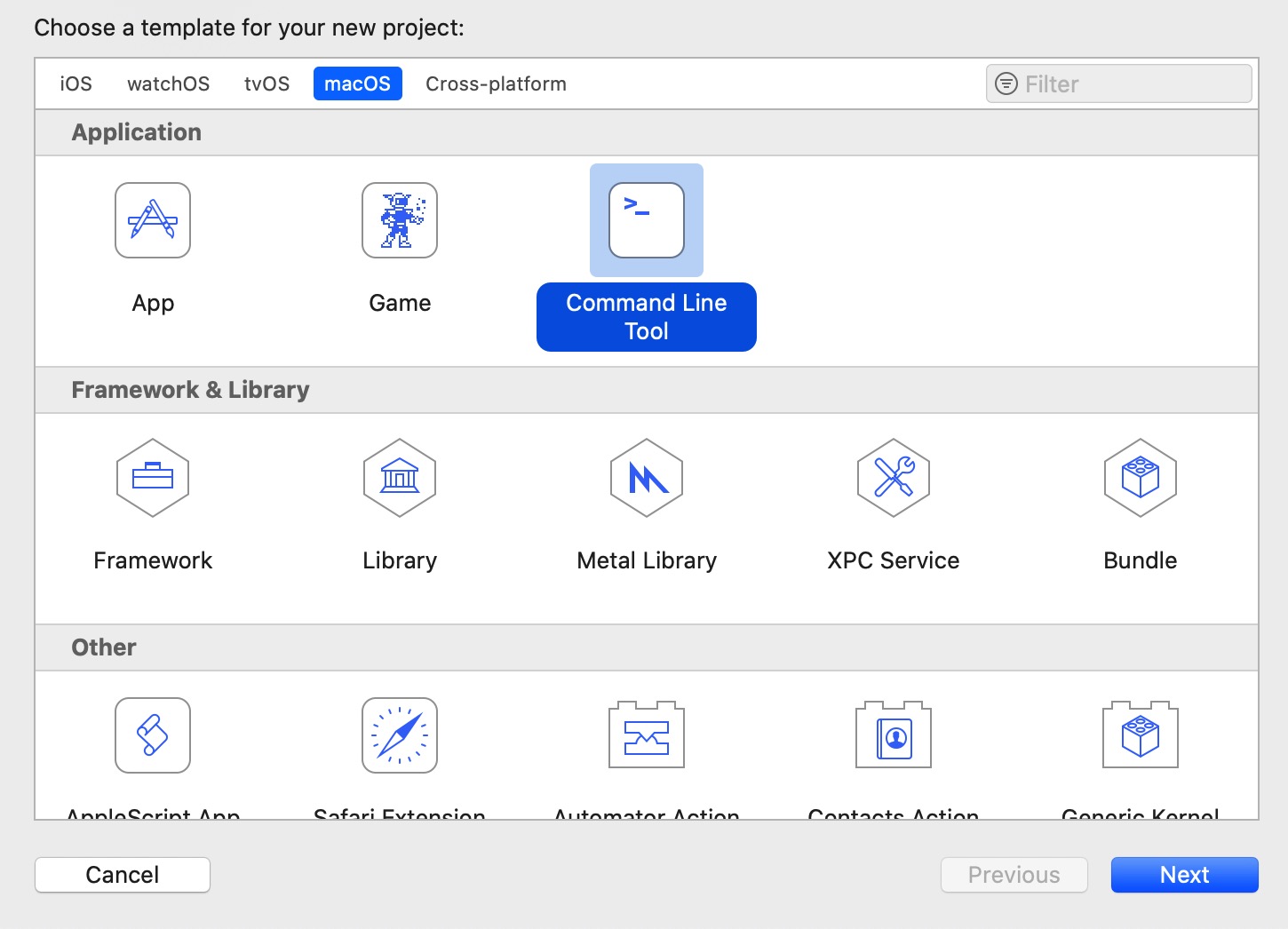 点击 Create a new Xcode project(创建一个新的 Xcode 项目),然后选择上方 macOS 中的 Command Line Tool(命令行工具),并点击右下角的 Next