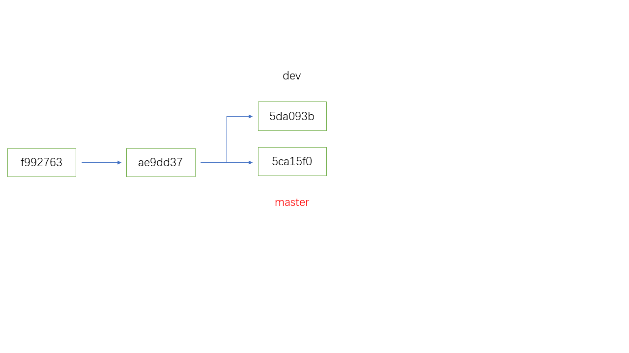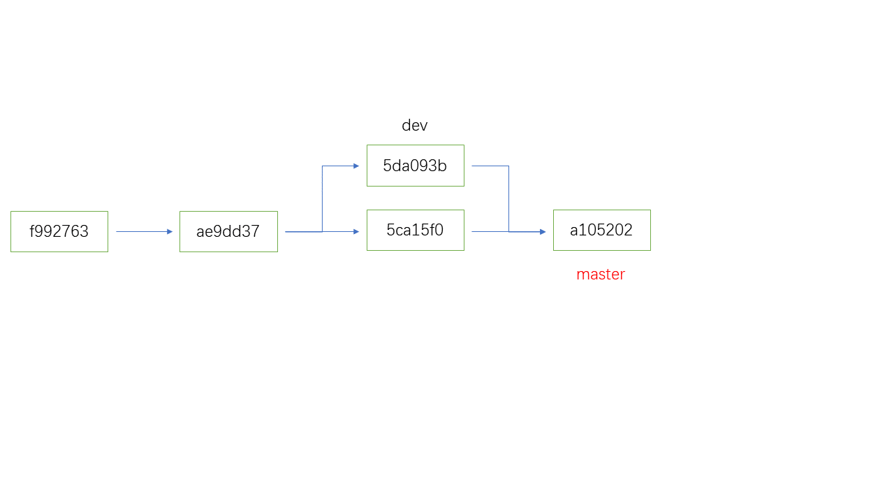 在合并之前,master 指向 5ca15f0,而 dev 指向 5da093b,这两个状态并不在一条链上。
